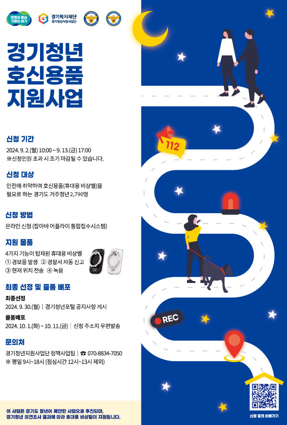 경기청년호신용품 지원사업은 경기청년지원사업단에서 주관하며 2024년 9월 2일부터 9월 13일까지 접수합니다.