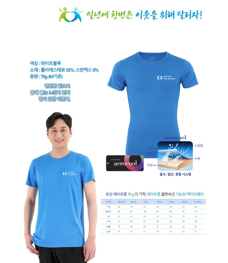 라이트블루 색상의 기능성 티셔츠를 기념품으로 제공합니다.